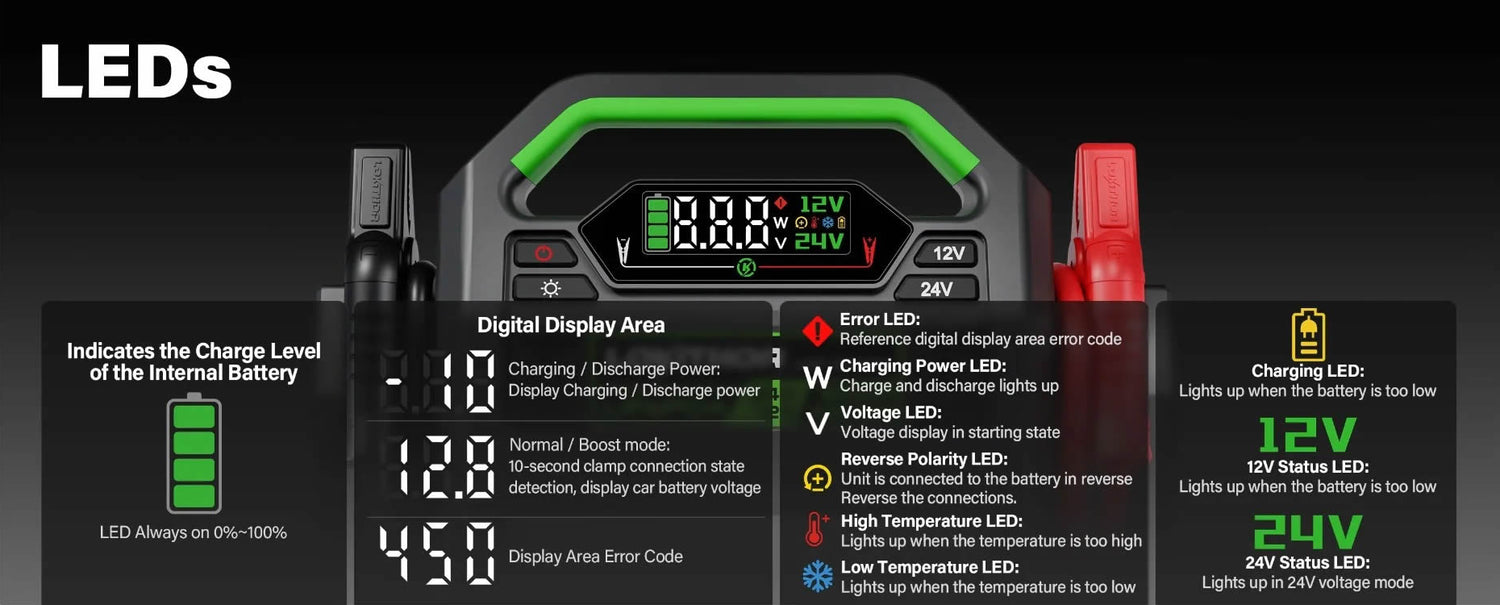 1. Rescue Jump Starter - Powerful 10000A @ 12v or 5000A @ 24v jump starts for big engine flat battery breakdowns in large trucks, large vans, industrial car yards, heavy machinery, road transport rigs, diesel power generators and more