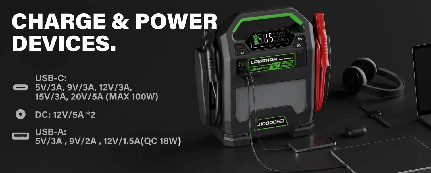 LOKITHOR "The Big Dog" 12V @ 10000A 24v @ 5000 Truck Jump Starter + USB Power Bank + LED Spotlight